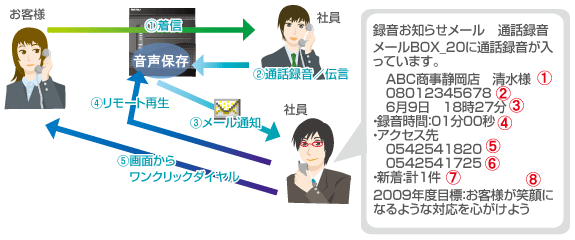 メッセージが録音されると、その情報をメールでモバイル端末へ通知します。場所、時間にとらわれず、あいてる時間にメッセージを確認したり相手に発信することが可能です。