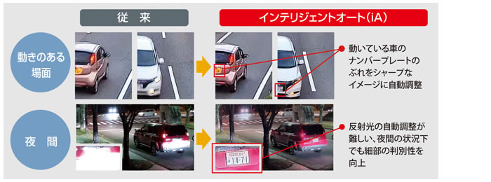インテリジェントオート機能搭載で、視認が厳しい環境での識別性を向上しました。人や車など移動する被写体の輪郭、ヘッドライトが反射する車のナンバープレートなど、従来見えづらかった箇所の識別性を向上しました。また、顔の位置を自動判別し明るさを調整するので、背景の明るさが変化したときの顔の判別性も向上しています。